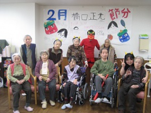 二月は ホームで職員が鬼に扮して利用者さまのところに乱入して 豆まきを行いました。